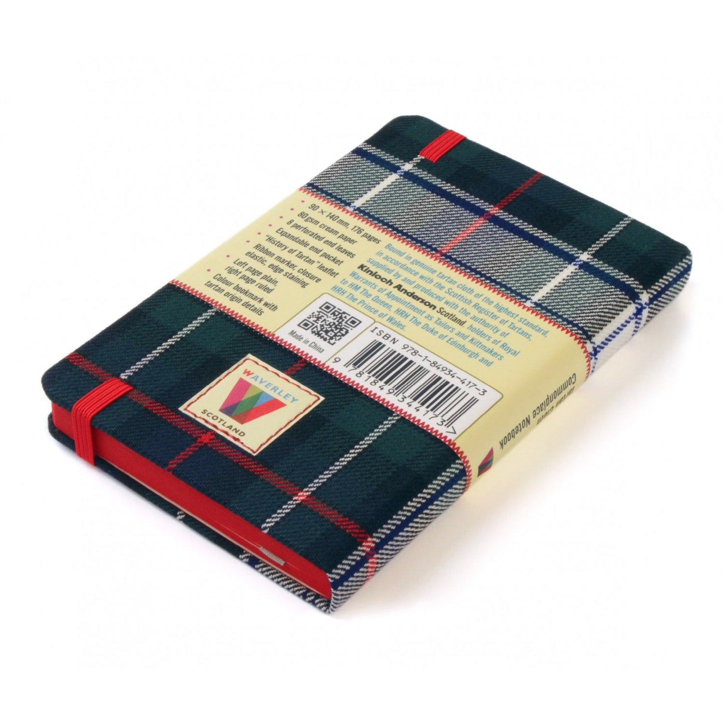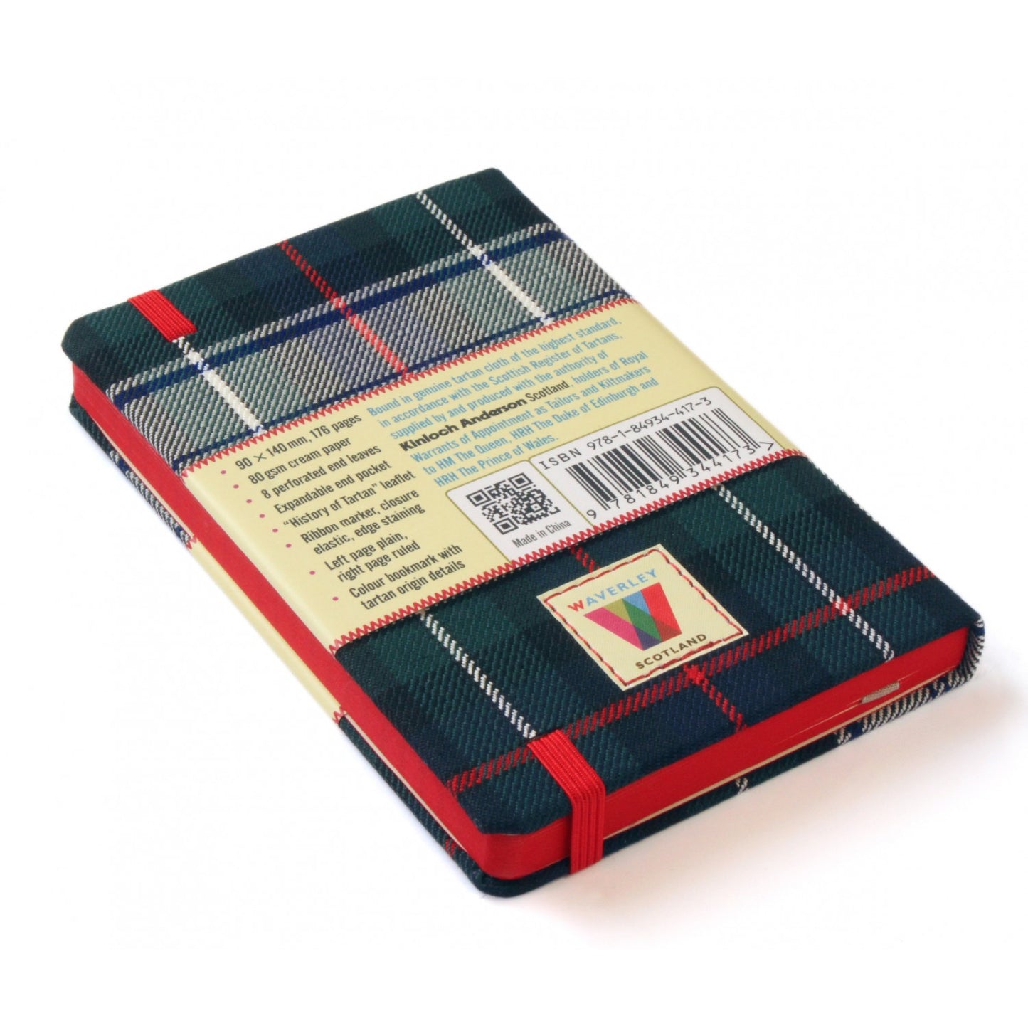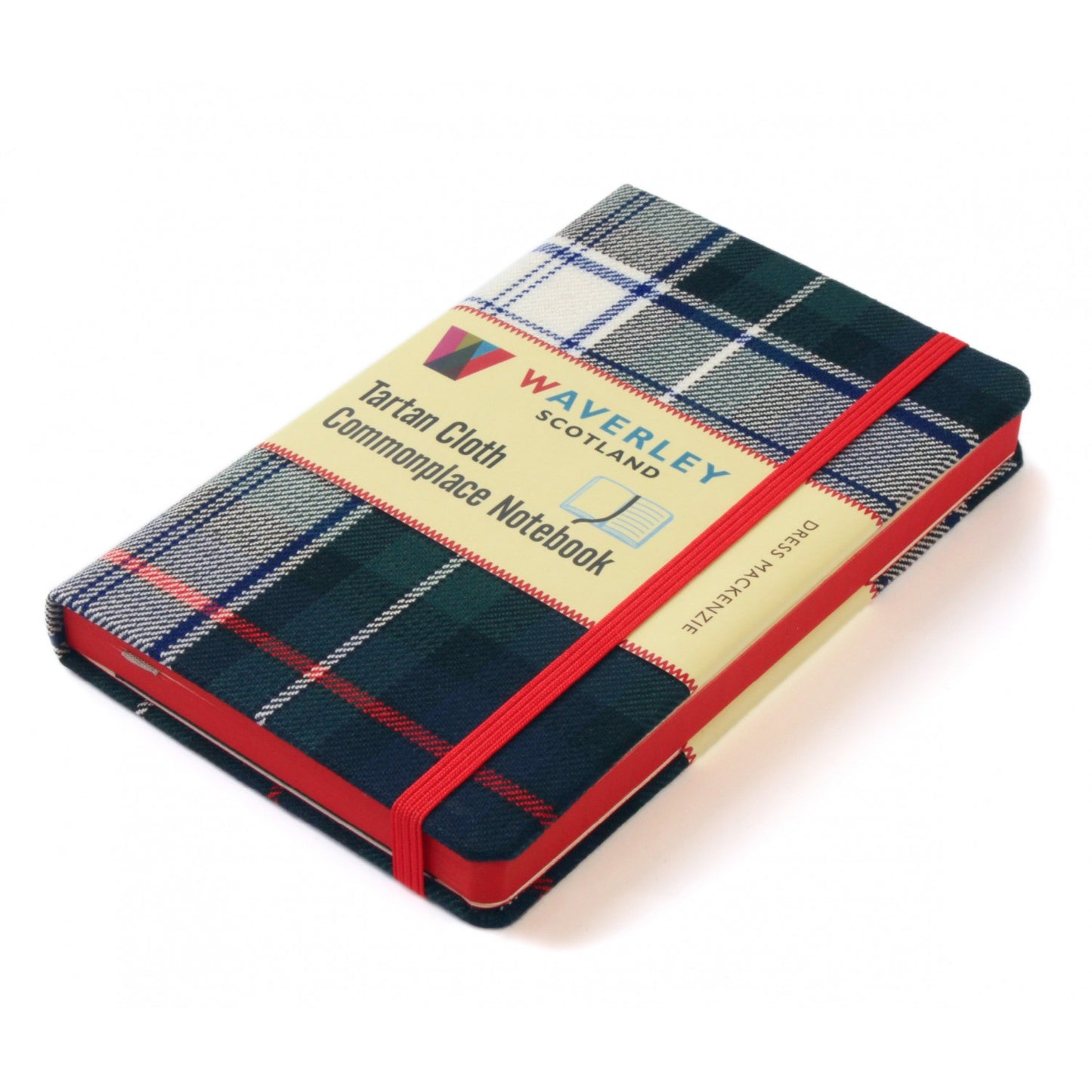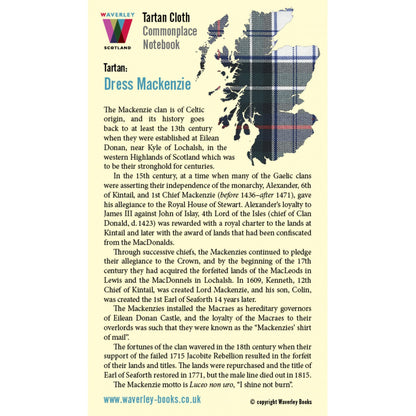 Le carnet en tissu tartan Dress Mackenzie de Waverley Scotland possède des couleurs de blanc avec des noirs foncés, des bleus et des verts et une seule bande rouge. Une caractéristique de nombreux tartans habillés est la couleur blanche. Tout comme les tartans de chasse utilisaient des couleurs sombres pour la chasse, de la même manière la plupart des tartans habillés adoptaient le blanc pour les occasions vestimentaires.