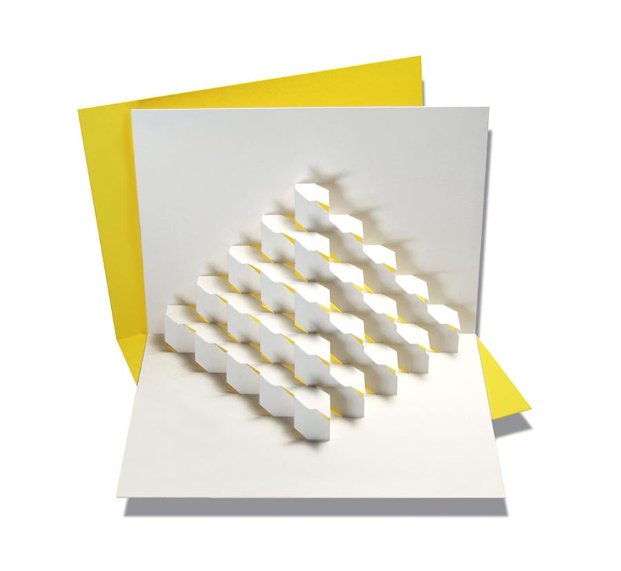 La carte Pop-Up Cube Jaune de Rifletto est une carte de vœux pour les amateurs de formes géométriques. Sans qu'aucune partie du papier ne soit découpée, la construction et le pliage ingénieux du pop-up donnent naissance à des cubes imbriqués les uns dans les autres. La couverture est d'un jaune vif. La carte fermée est au format A6. Une enveloppe blanche doublée assortie est incluse.