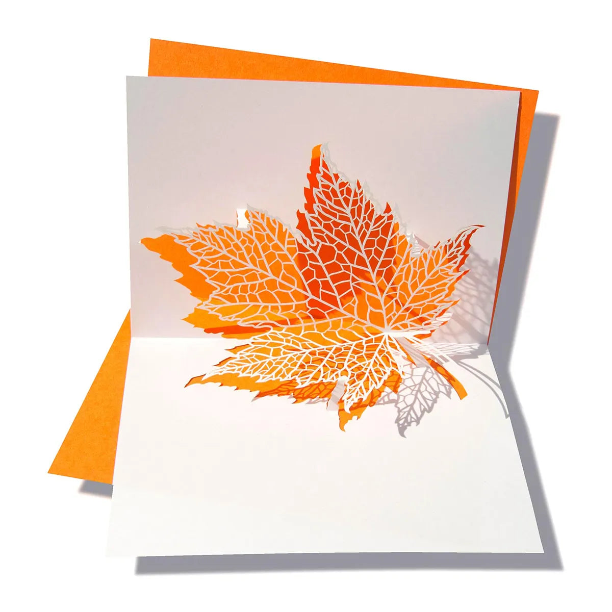 Une carte de vœux pour l'automne représentant une magnifique feuille d'érable. La feuille pop-up est filigranée au laser et doublée d'une enveloppe orange vif. La carte fermée est au format A6 et s'accompagne d'une enveloppe blanche doublée assortie incluse.