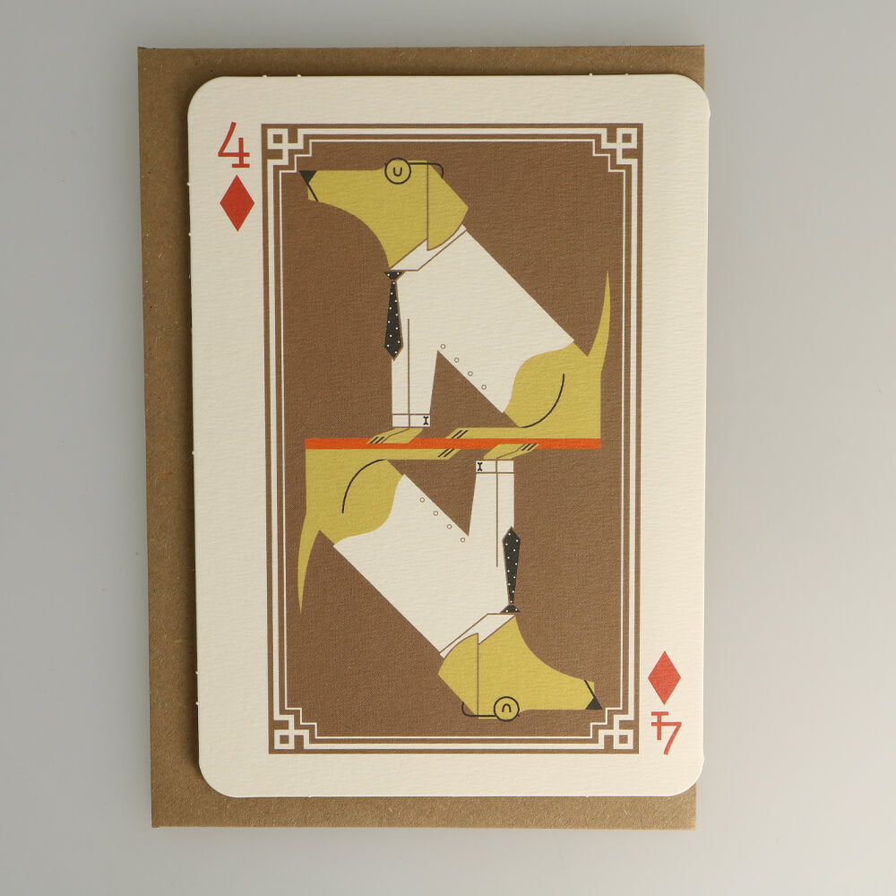 Cette carte de vœux A6 de cirque d'inspiration vintage est imprimée sur un papier texturé crème pâle de qualité. Le concept de carte à jouer se poursuit au verso avec un imprimé géométrique coordonné. Présenté avec une enveloppe kraft à l'intérieur d'une pochette cello.