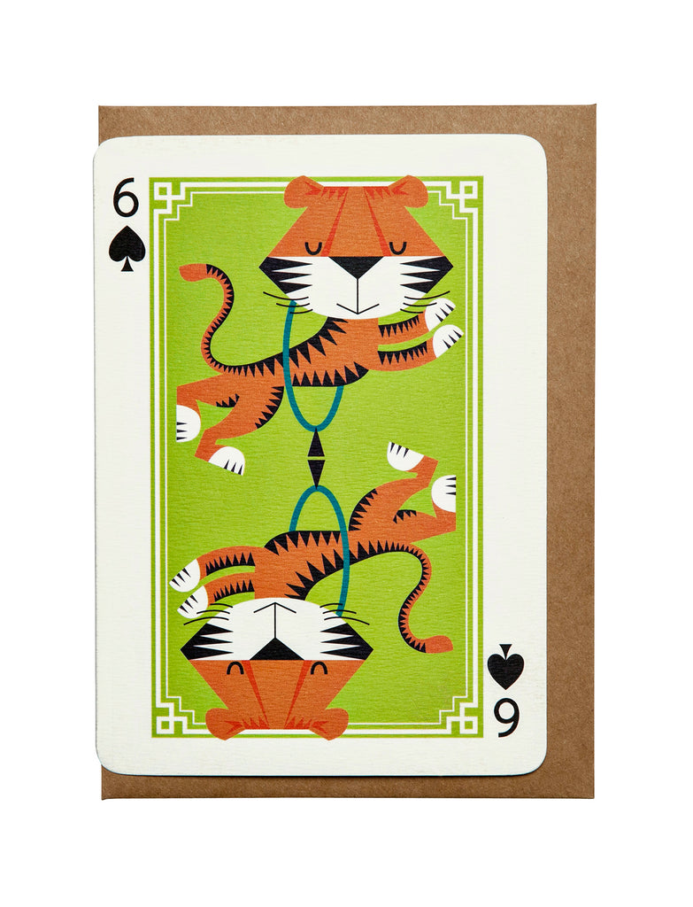 Cette carte de vœux A6 de cirque d'inspiration vintage est imprimée sur un papier texturé crème pâle de qualité. Le concept de carte à jouer se poursuit au verso avec un imprimé géométrique coordonné. Présenté avec une enveloppe kraft à l'intérieur d'une pochette cello.