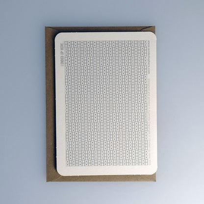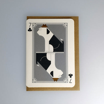 Cette carte de vœux A6 de cirque d'inspiration vintage est imprimée sur un papier texturé crème pâle de qualité. Le concept de carte à jouer se poursuit au verso avec un imprimé géométrique coordonné. Présenté avec une enveloppe kraft à l'intérieur d'une pochette cello.