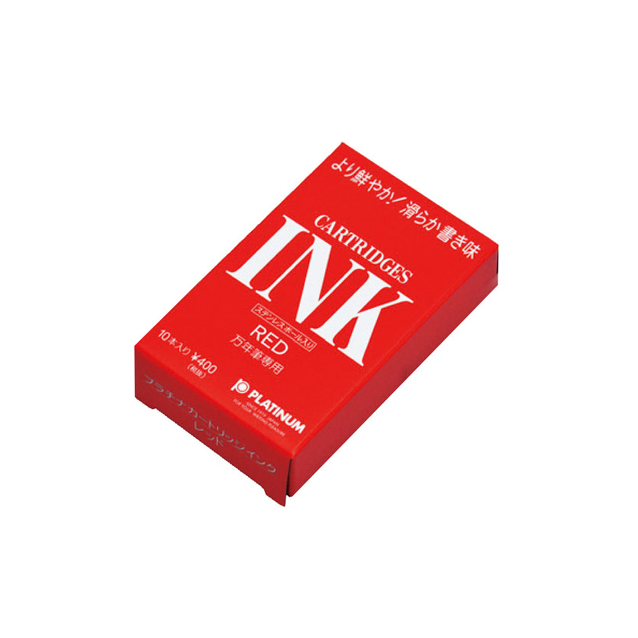 Paquet de 10 cartouches d'encre rouge dyestuff Platinum à base d'eau, destiné à être utilisé exclusivement avec les stylos plume Platnium.