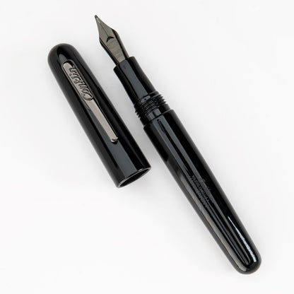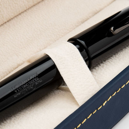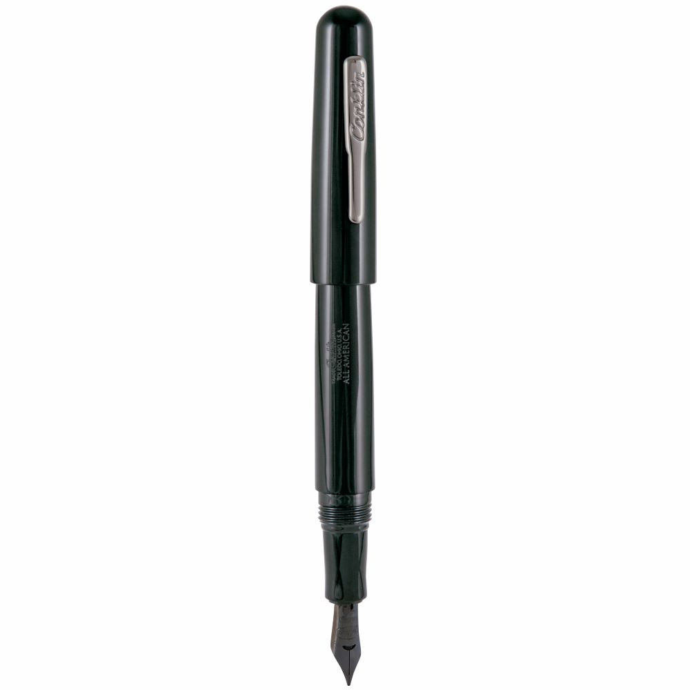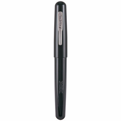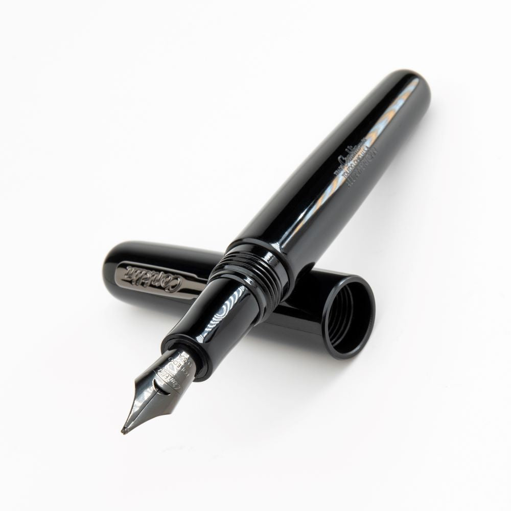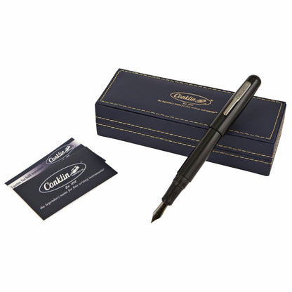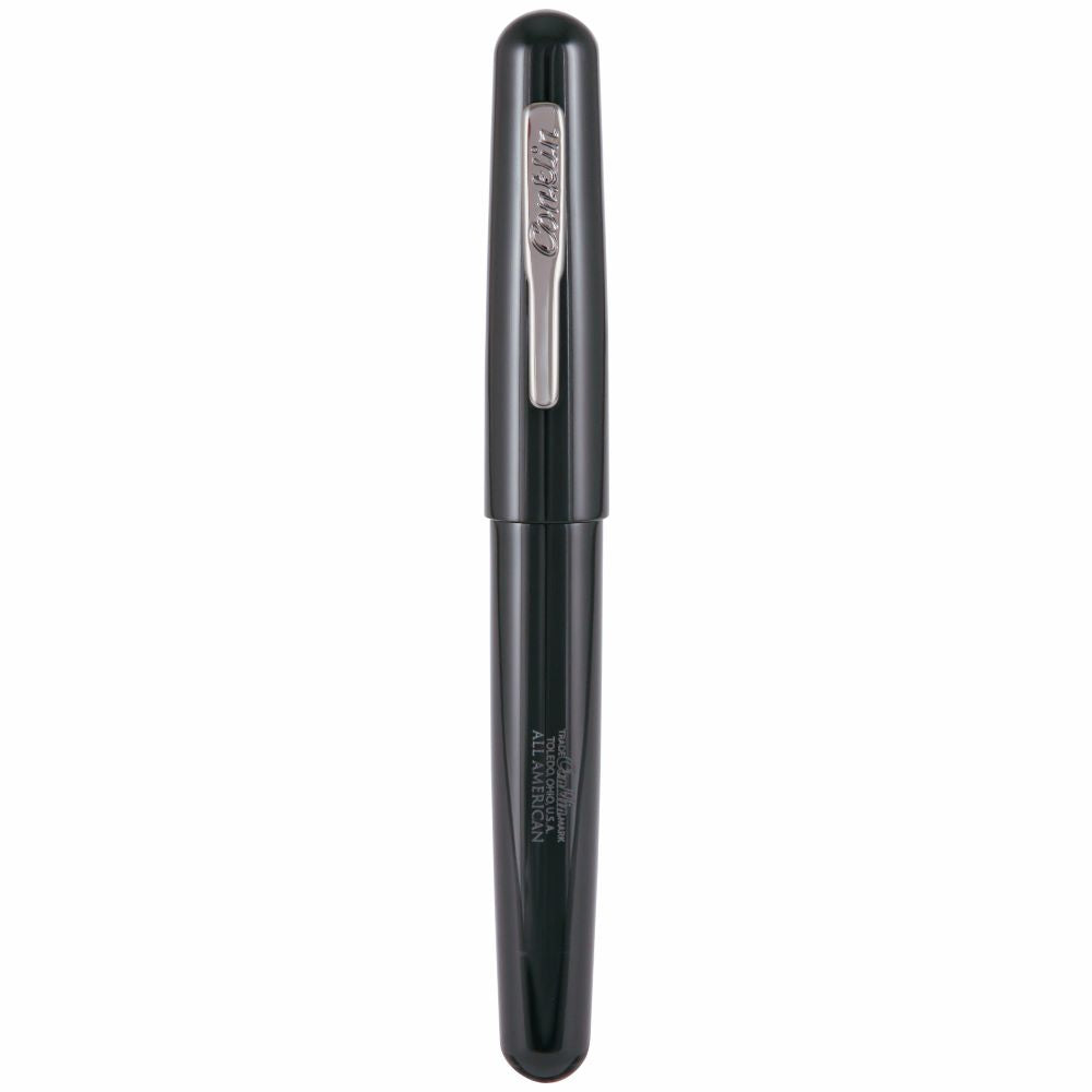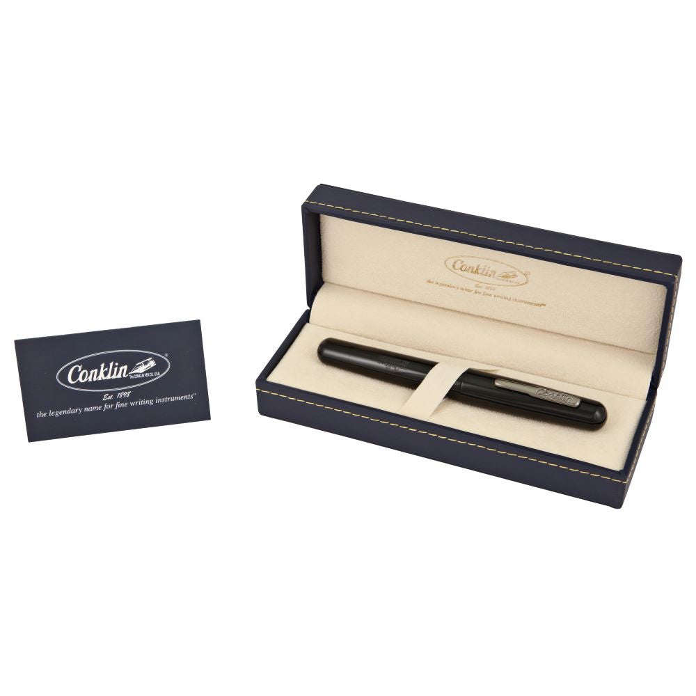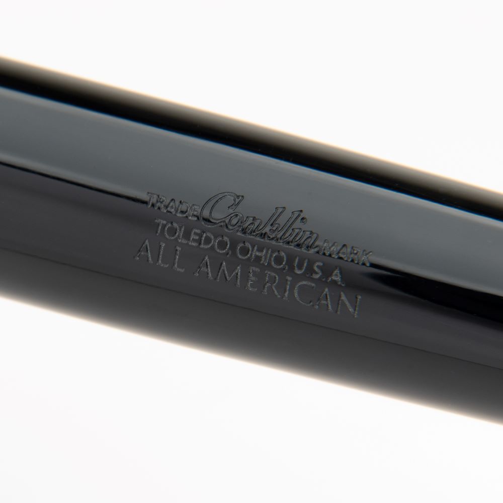 Les capuchons effilés sont dotés d'attaches de style « rocker » et les barils sont gravés du nom de la marque Conklin et du logo All American. Cette collection convient aux personnes qui recherchent un stylo de grande taille au design unique, restant fidèle aux modèles originaux de Conklin. Chaque plume Cushion Point en acier inoxydable affiche le nom de la marque et est marquée de trous de respiration spéciaux en forme de croissant. Ce stylo plume est disponible dans la couleur Raven Black avec une plume extra fine (EF).