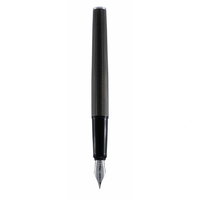 - Corps en métal au décor grain d’orge obtenu par une fine guilloche et recouvert d’une fine couche colorée gris foncée apportant style et personnalité. Attributs chromés. Stylo plume avec une plume en acier inoxydable.