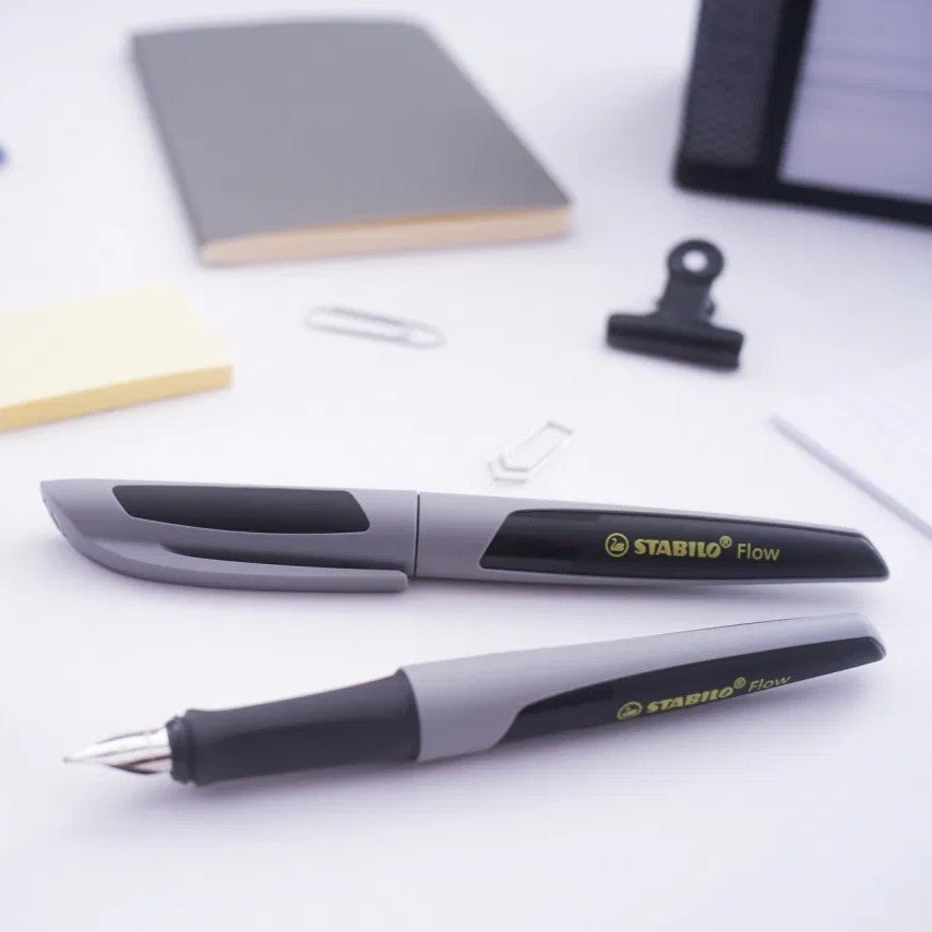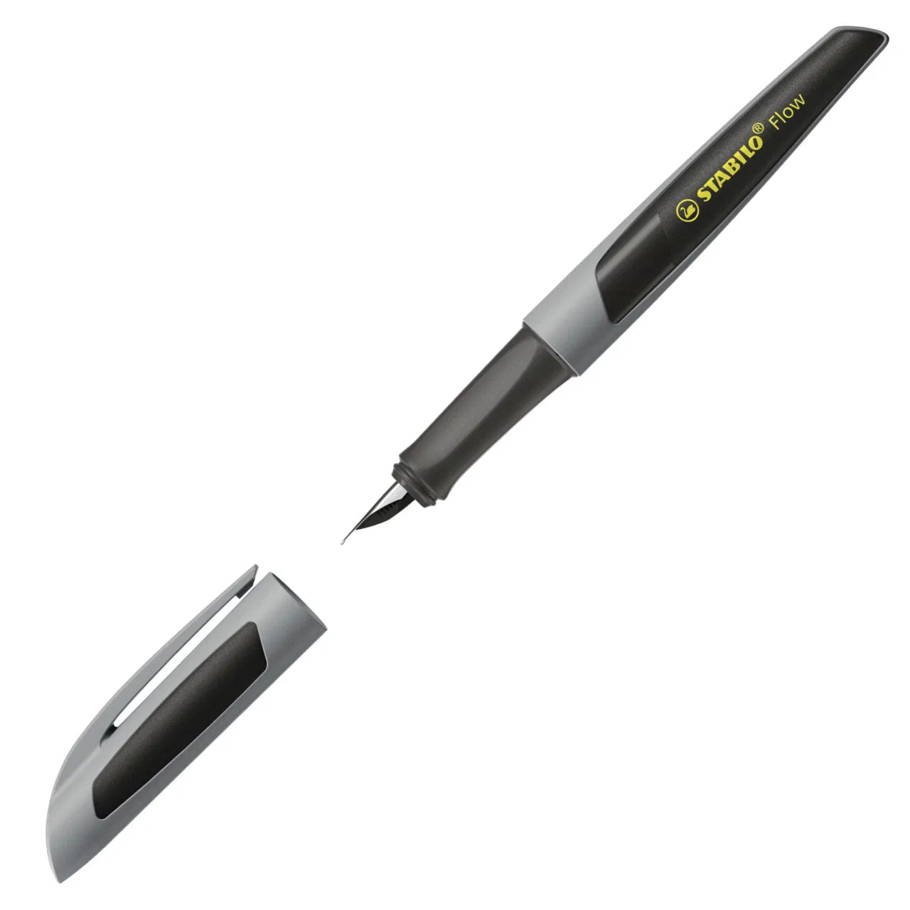 Le Stabilo Flow est un stylo-plume qui associe qualité, design et couleurs tendance. La collection Active se caractérise par des couleurs sobres associées à l'utilisation d'une couleur vive pour l'inscription sur le corps du stylo. Ce modèle gris avec inscription jaune vif est doté d’une plume M haute qualité (tracé 0,5 mm) en acier inoxydable et finition iridium, le stylo-plume Stabilo Flow assure une prise de notes nette et fluide sans taches ni bavures. Son capuchon antifuites avec amortisseur empêche les effets d’aspiration. Son grip ergonomique permet un grand confort d’écriture. Il est rechargeable avec des cartouches d’encre standard.