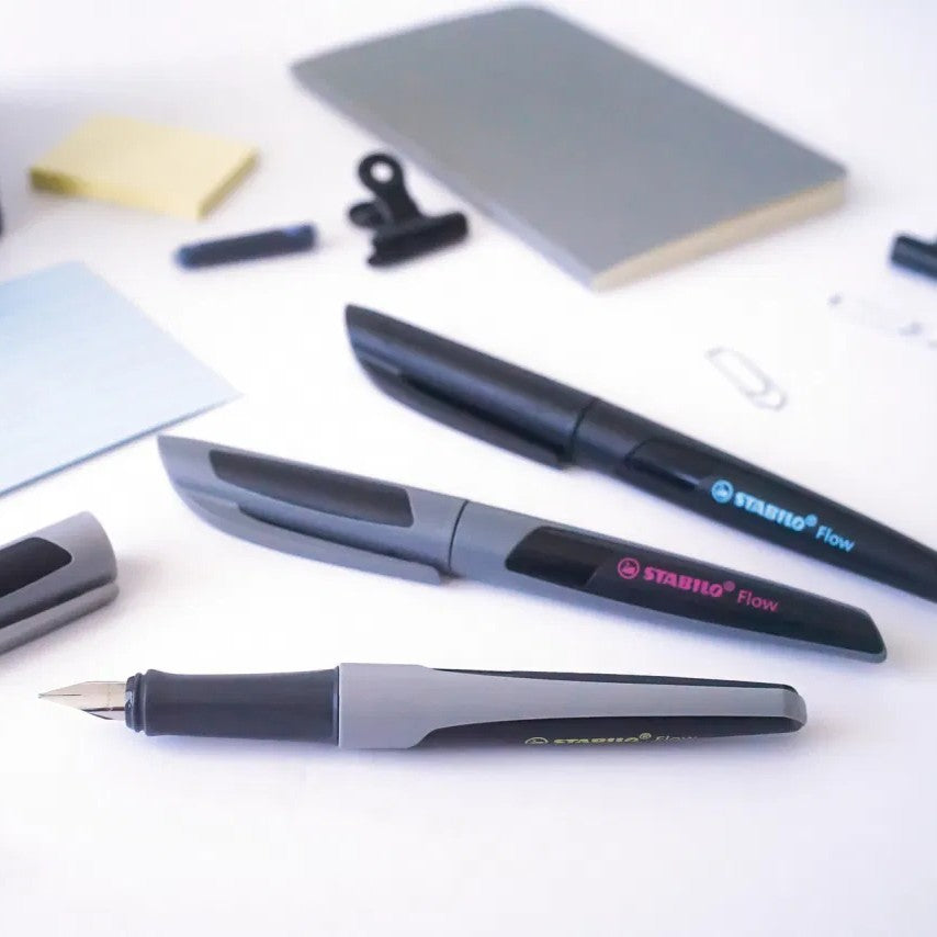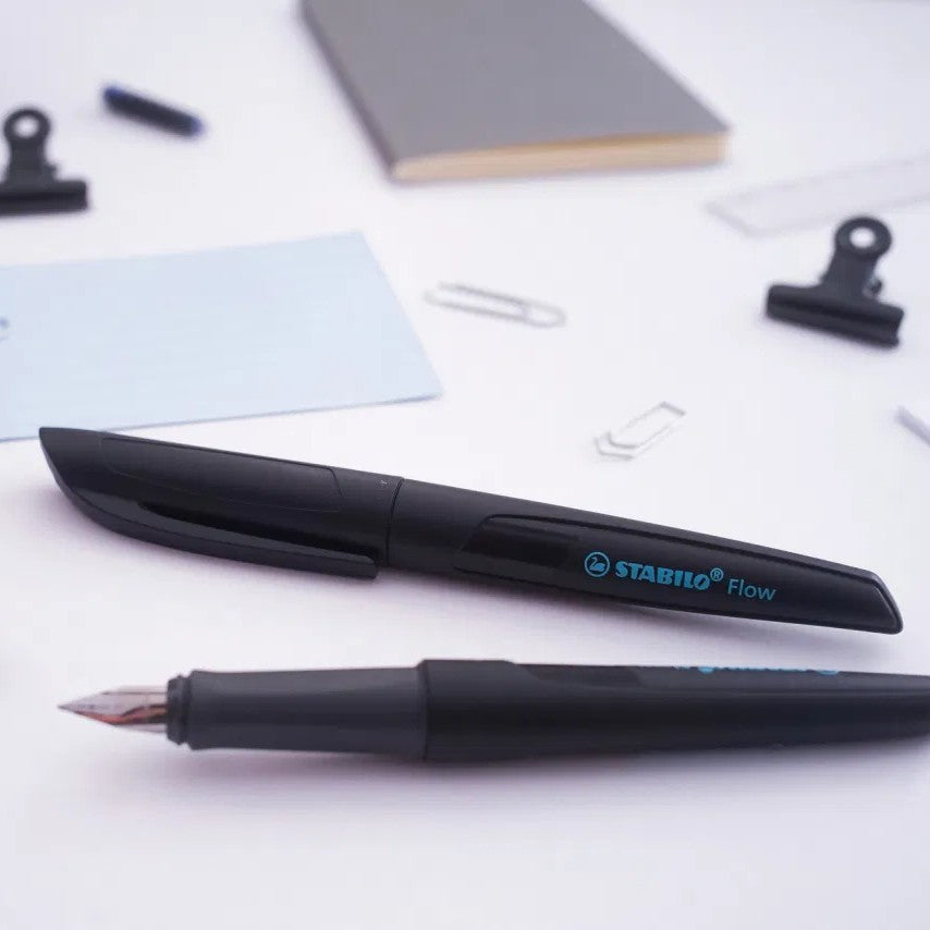 Le Stabilo Flow est un stylo-plume qui associe qualité, design et couleurs tendance. La collection Active se caractérise par des couleurs sobres associées à l'utilisation d'une couleur vive pour l'inscription sur le corps du stylo. Ce modèle noir avec inscription bleu vif est doté d’une plume M haute qualité (tracé 0,5 mm) en acier inoxydable et finition iridium, le stylo-plume Stabilo Flow assure une prise de notes nette et fluide sans taches ni bavures. Son capuchon antifuites avec amortisseur empêche les effets d’aspiration. Son grip ergonomique permet un grand confort d’écriture. Il est rechargeable avec des cartouches d’encre standard.