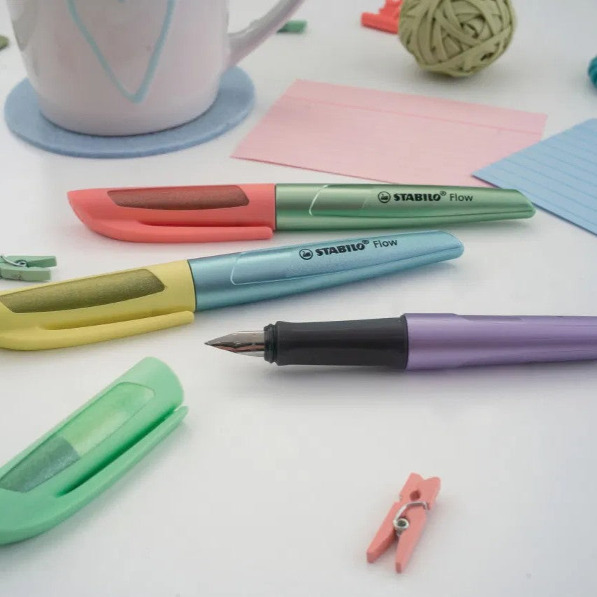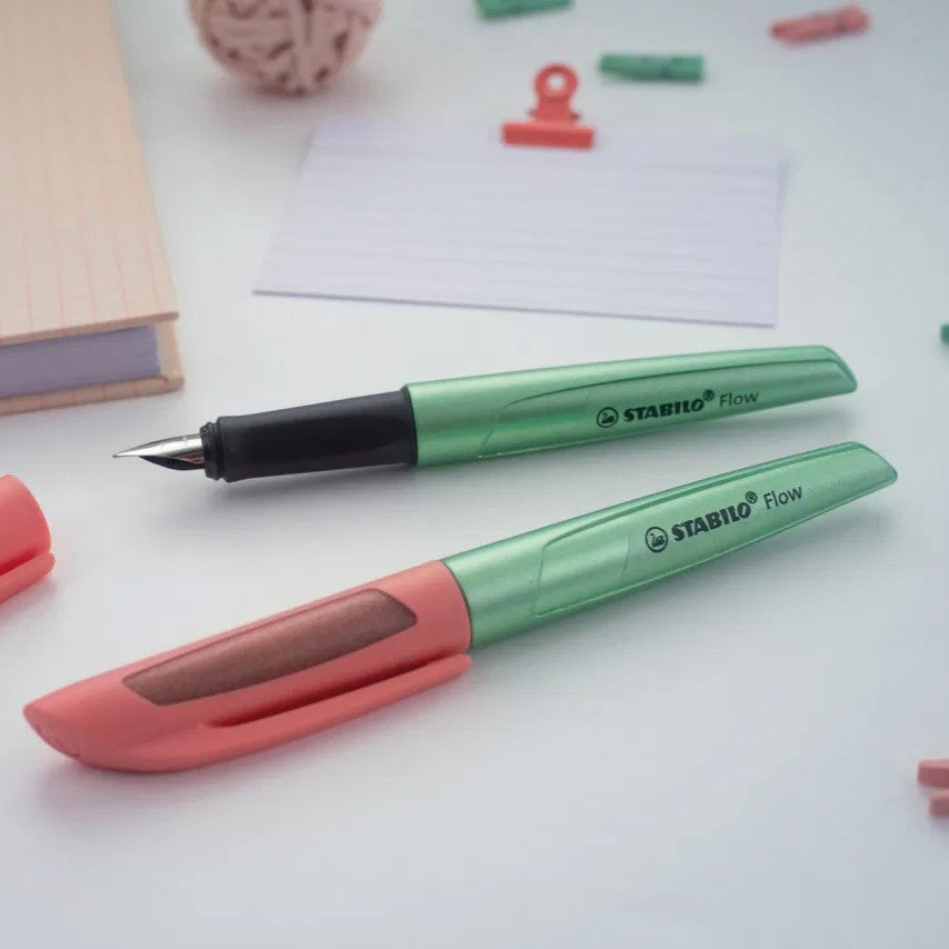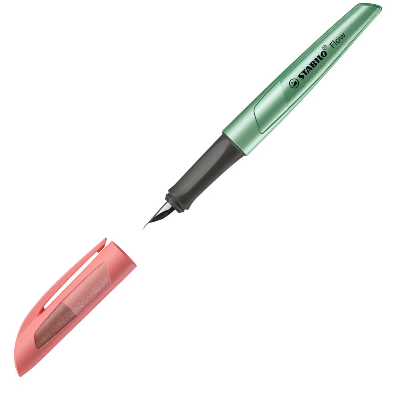 Le Stabilo Flow est un stylo-plume qui associe qualité, design et couleurs tendance. La collection Cosmetic se caractérise par l'association d'une couleur acidulée pour le capuchon avec une couleur métallisée pour le corps du stylo. Ce modèle est de couleur vert métallisé, avec un capuchon rose. Doté d’une plume M haute qualité (tracé 0,5 mm) en acier inoxydable et finition iridium, le stylo-plume Stabilo Flow assure une prise de notes nette et fluide sans taches ni bavures. Son capuchon antifuites avec amortisseur empêche les effets d’aspiration. Son grip ergonomique permet un grand confort d’écriture. Il est rechargeable avec des cartouches d’encre standard.