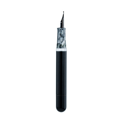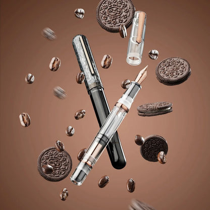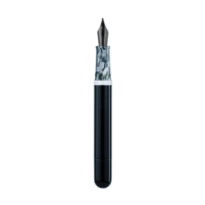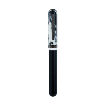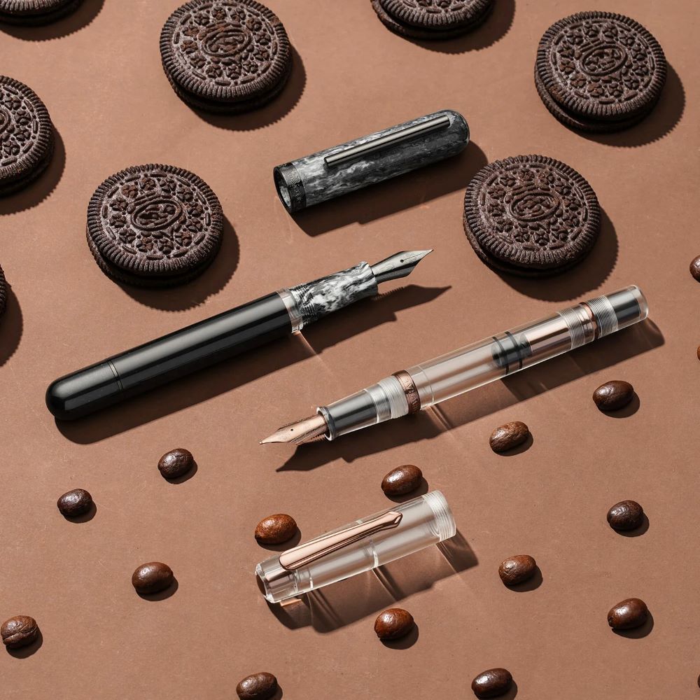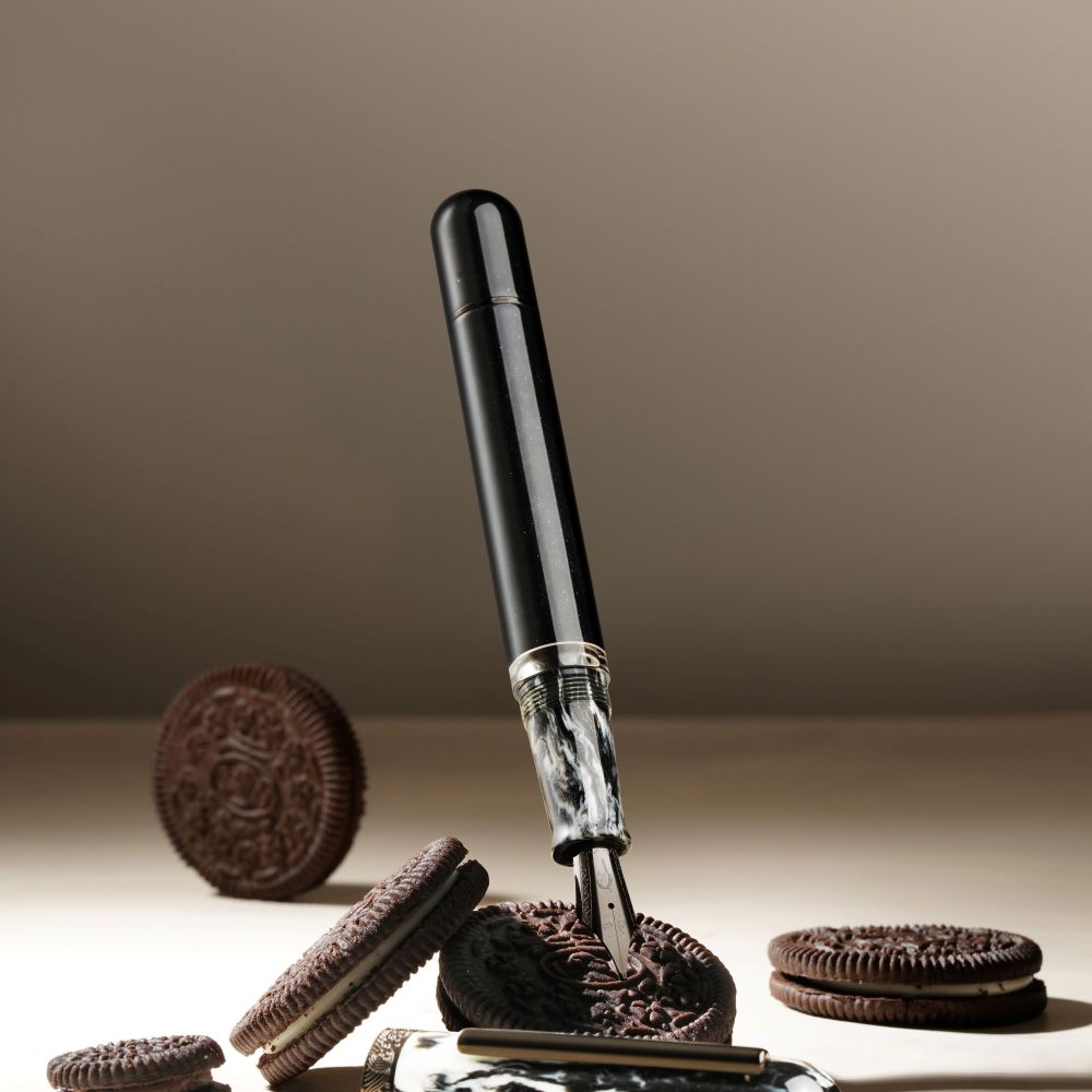 Installez-vous confortablement cet automne avec un vrai bijou de stylo ! Le Voyage : Cookies and Cream est notre premier stylo fabriqué avec deux résines différentes. Le corps du stylo est fait d’une résine noire légèrement scintillante, tandis que la section et le capuchon sont composés d’un mélange tourbillonnant de noir et de blanc, évoquant un biscuit plongeant dans un verre de lait ! Pour parfaire le design, nous avons équipé le Voyage : Cookies and Cream d’accessoires noirs et d’une plume noire.