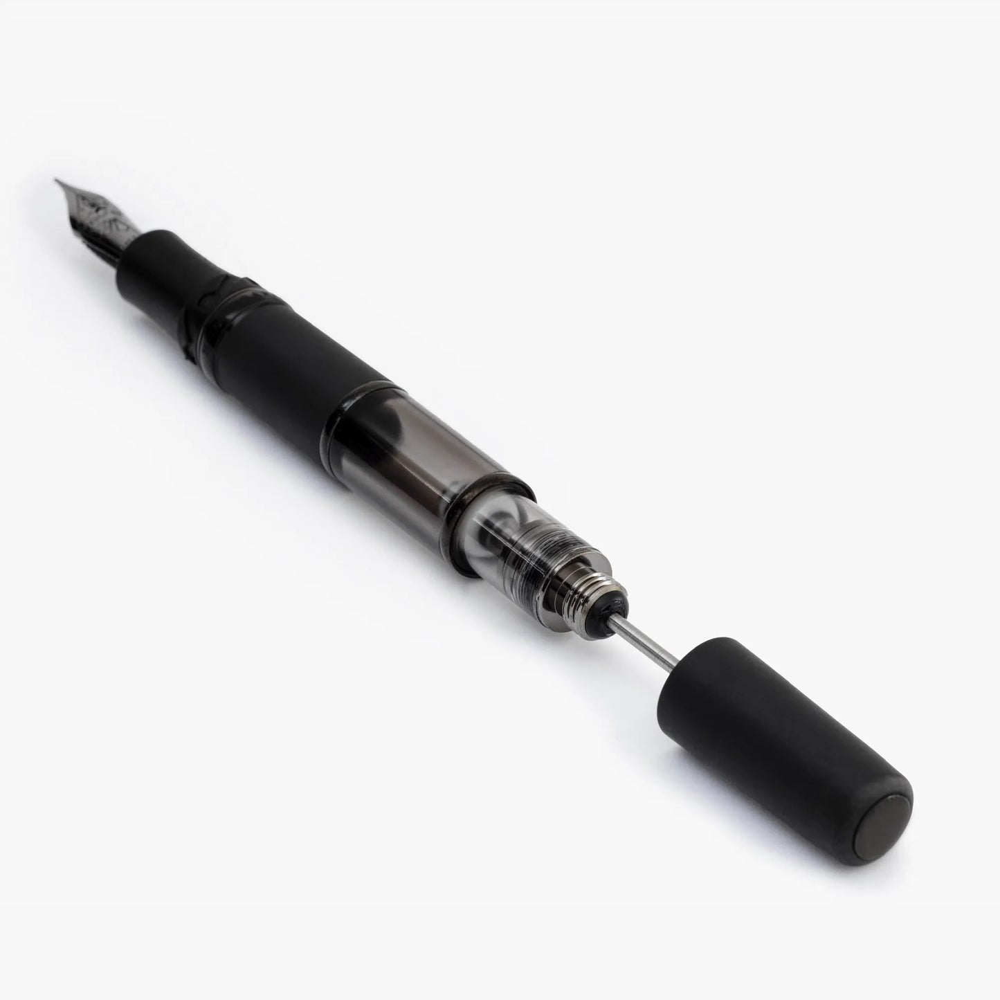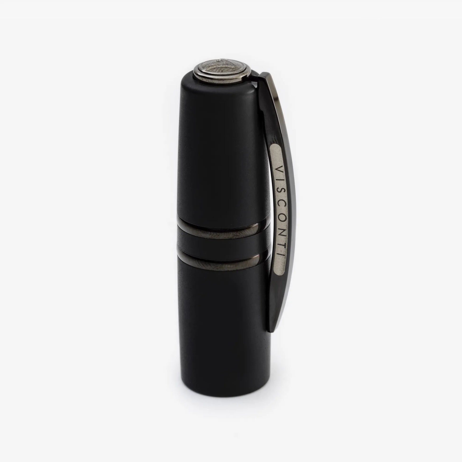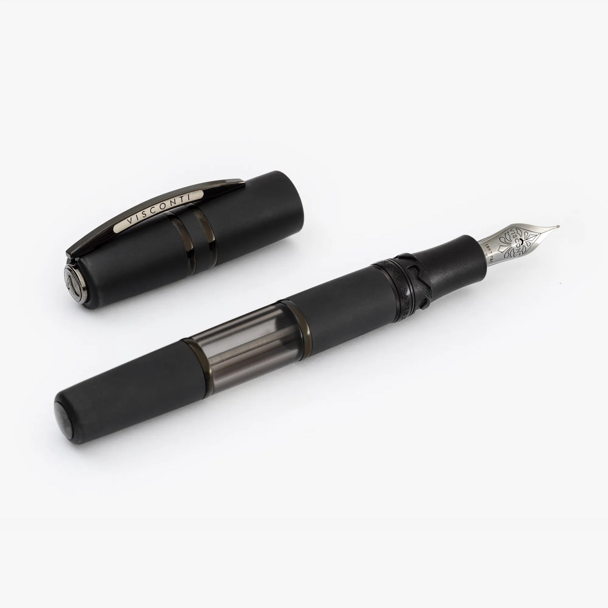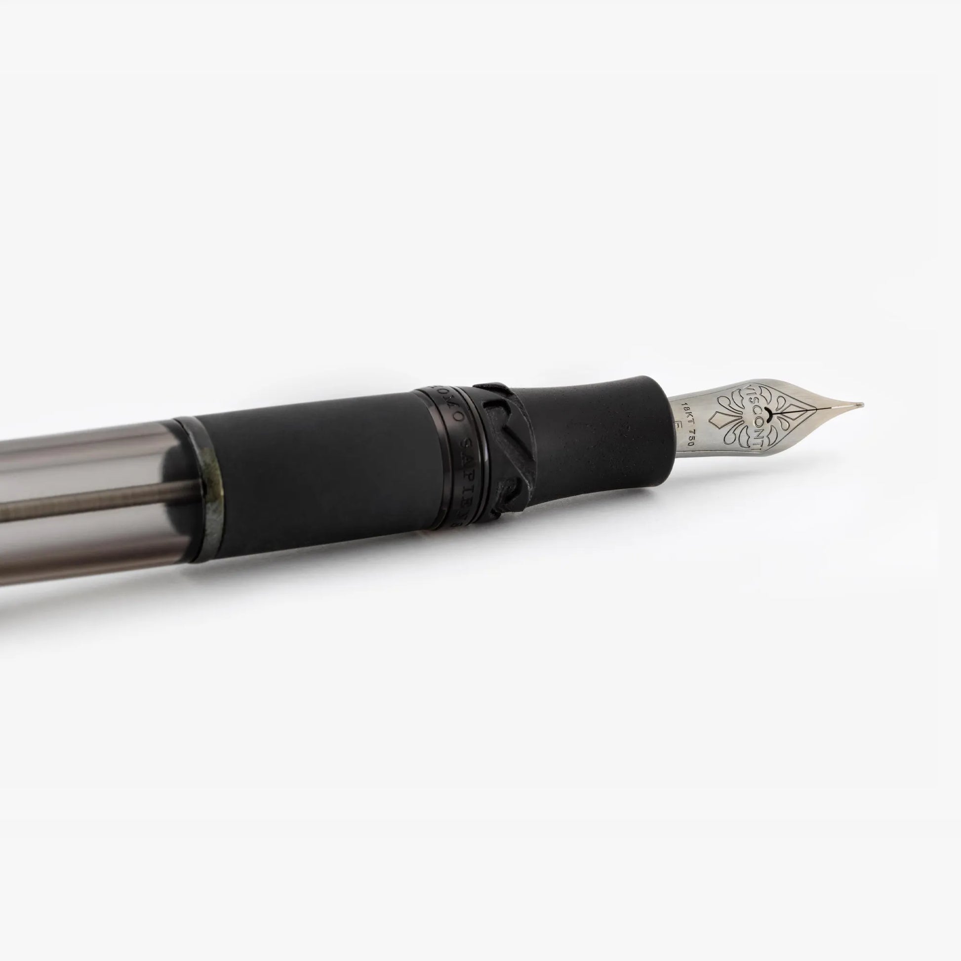 Même les plus petits composants du stylo nécessitent le plus grand soin et l'attention de nos artisans. Le corps de l'Homo Sapiens Dark Crystal est en résine fumée transparente et porte le nom de la collection en relief. Le capuchon présente l'emblématique clip en laiton noir brillant (résultat obtenu par galvanoplastie) et le logo Visconti qui se détache sur son fond ivoire brillant. Le logo situé à l'extrémité du capuchon reprend la couleur sombre de l'instrument d'écriture, mais il peut être remplacé et personnalisé grâce à notre système Mypensystem.