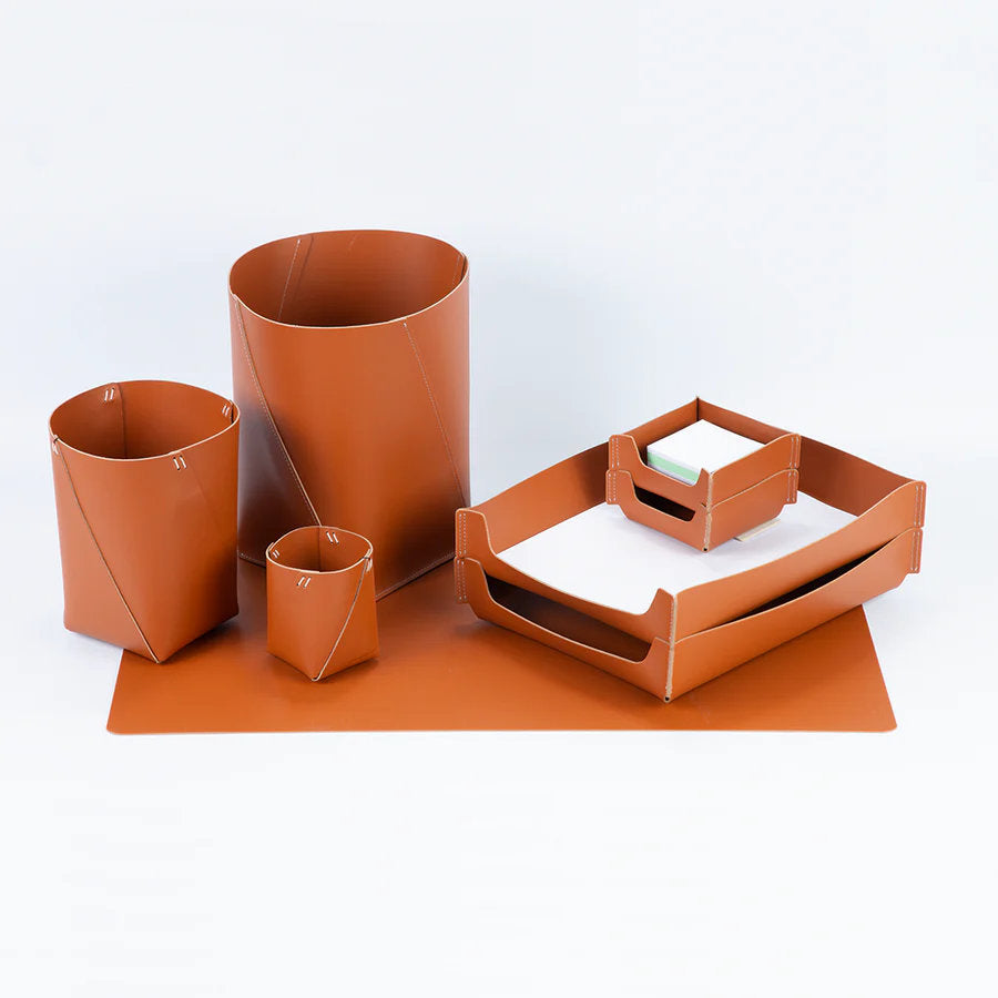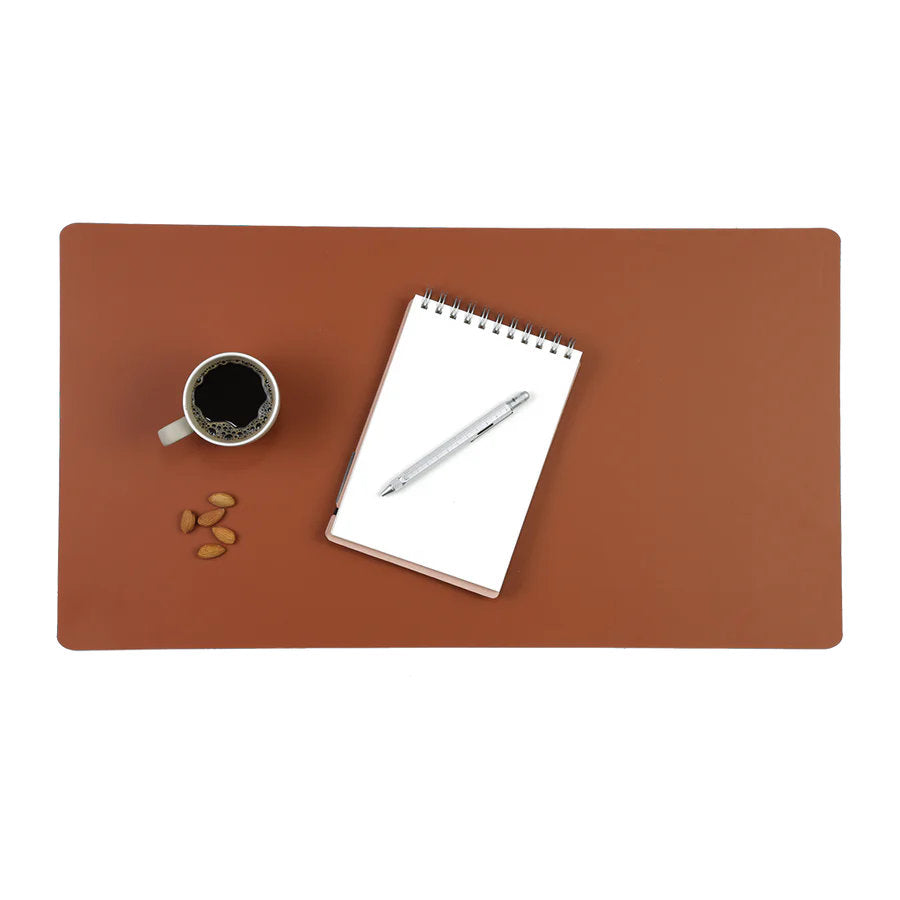 Un sous-main rectangulaire, sobre et fonctionnel. Il peut être utilisé aussi bien à la maison qu'au bureau. Il s'agit d'un produit durable, fabriqué à la main avec du cuir recyclé à 100 %. Ce tapis de bureau est de couleur marron.