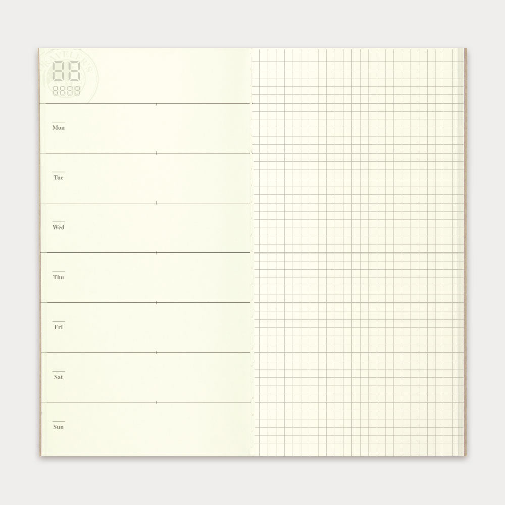 Un agenda hebdomadaire Traveler's Company avec un espace mémo d'une page. Sur le côté gauche, vous avez la section où vous pouvez écrire vos plans, et sur le côté droit, vous avez la section mémo où les grilles sont imprimées pour faciliter l'écriture et le dessin. Un seul carnet couvre six mois, et vous pouvez le personnaliser comme vous le souhaitez.